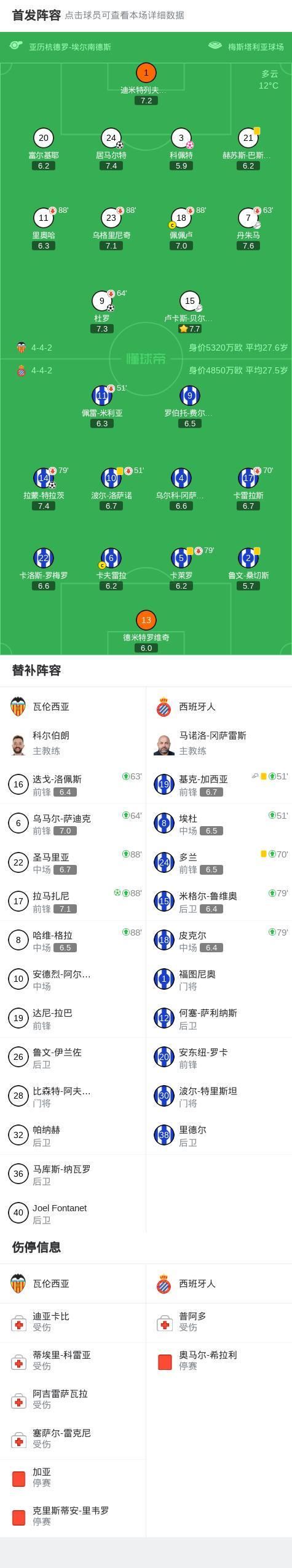 北京时间1月24日,西班牙足球甲级联赛第21轮,瓦伦西亚主场对阵西班牙人。杜罗率先破门,拉蒙-特拉茨随后为西班牙人扳平比分。居马尔特接应助攻再度帮助瓦伦西亚取得领先,但科佩特不慎自摆乌龙,使双方重回同一起跑线。补时阶段,拉马扎尼主罚点球命中,助瓦伦西亚完成绝杀。最终瓦伦西亚3比2战胜西班牙人。