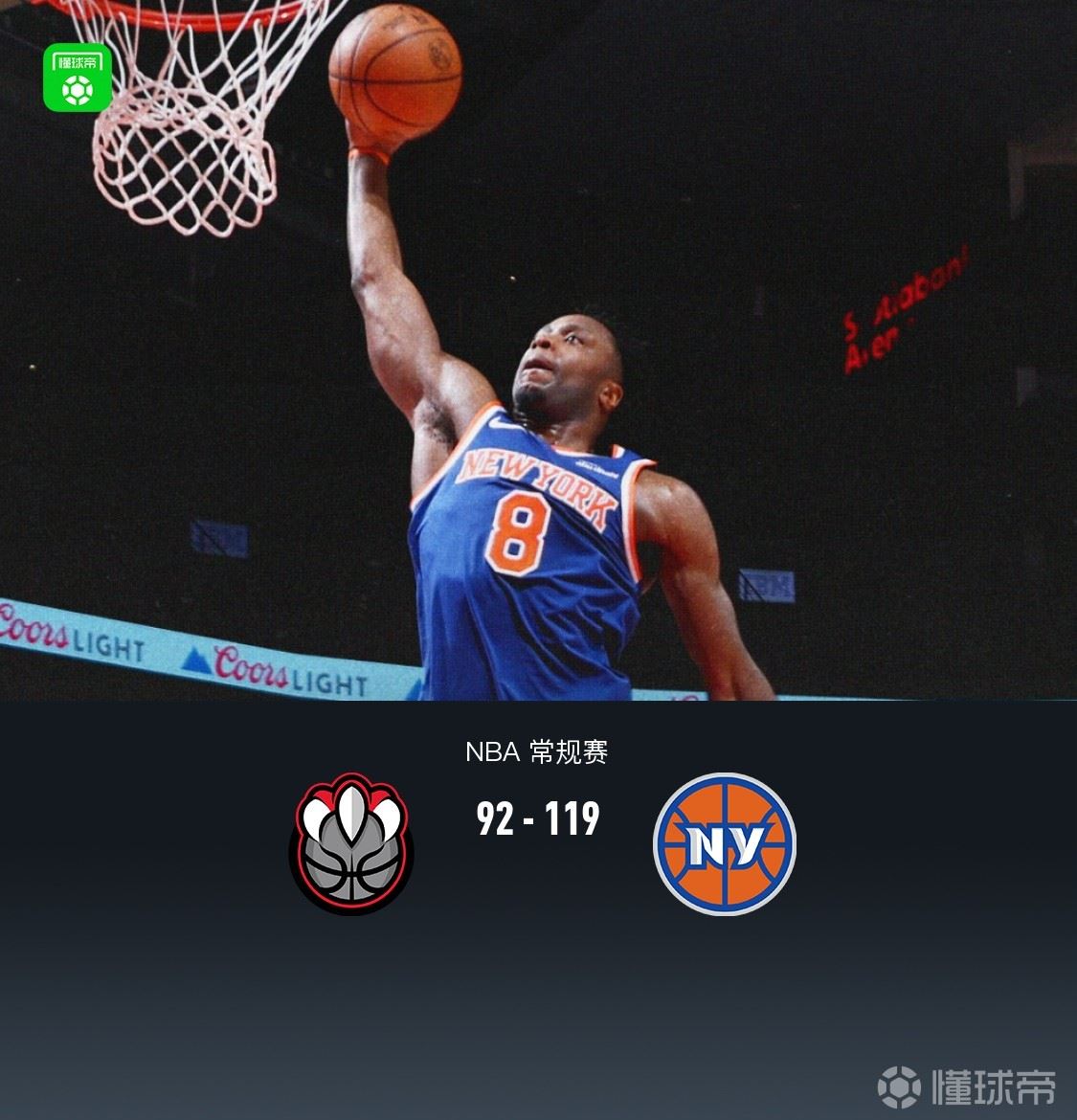 第四节猛龙马穆凯拉什维利拿下7分,尼克斯约什-哈特拿下11分,最终猛龙92-119不敌尼克斯