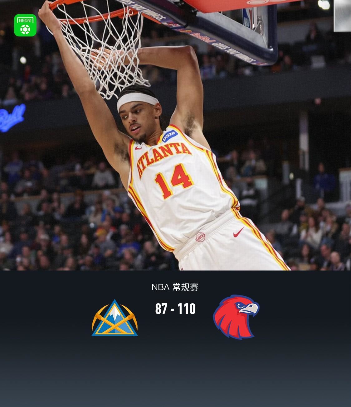 第四节掘金纳吉拿下5分,老鹰杰伦-约翰逊拿下12分,最终掘金87-110不敌老鹰